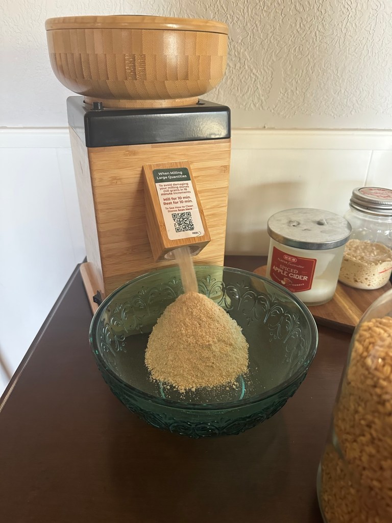First, mill the flour. I use half soft wheat and half einkorn. This takes just a bit longer since I have two types of wheat berries to mill, but it is worth it!