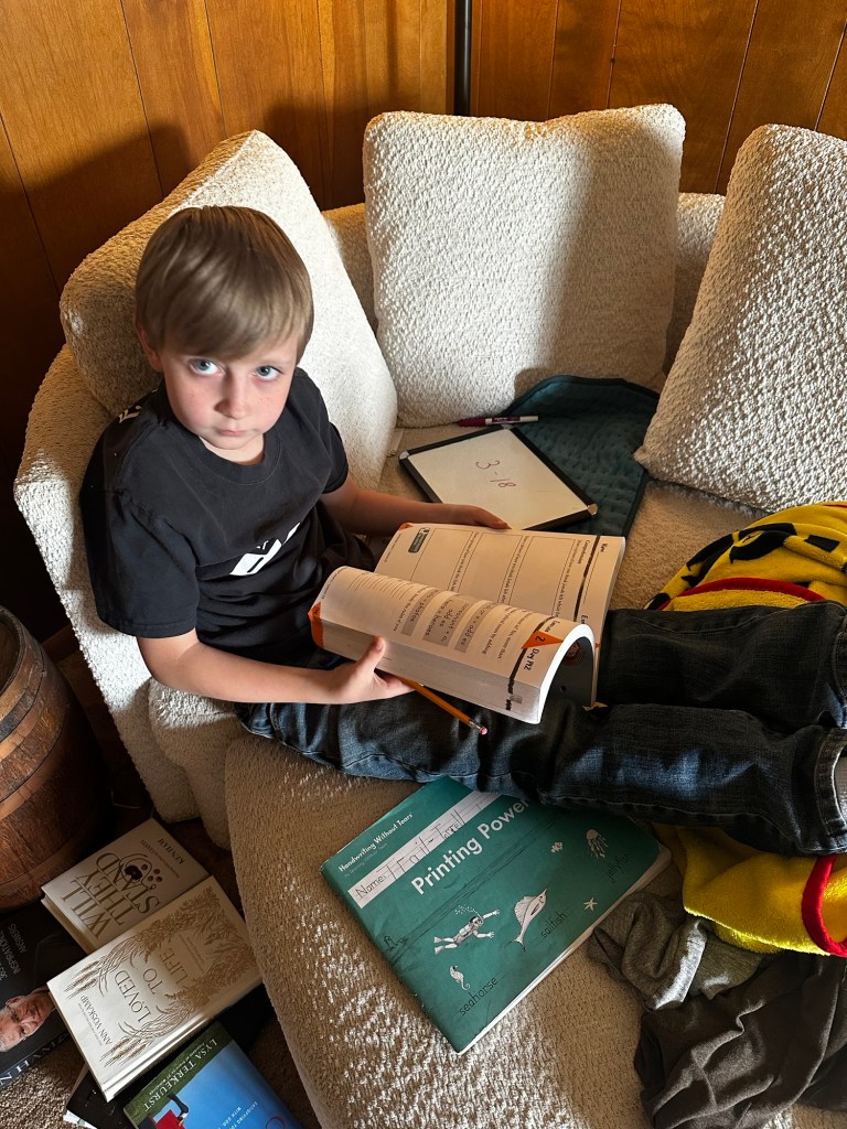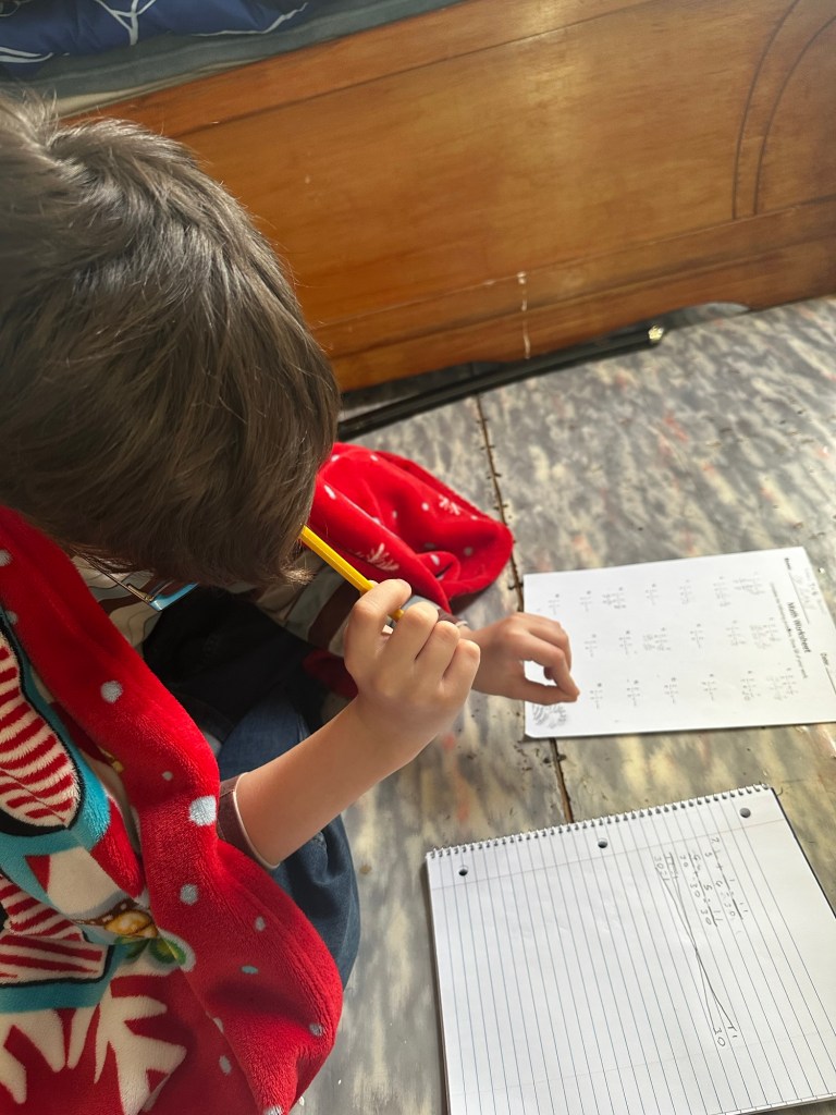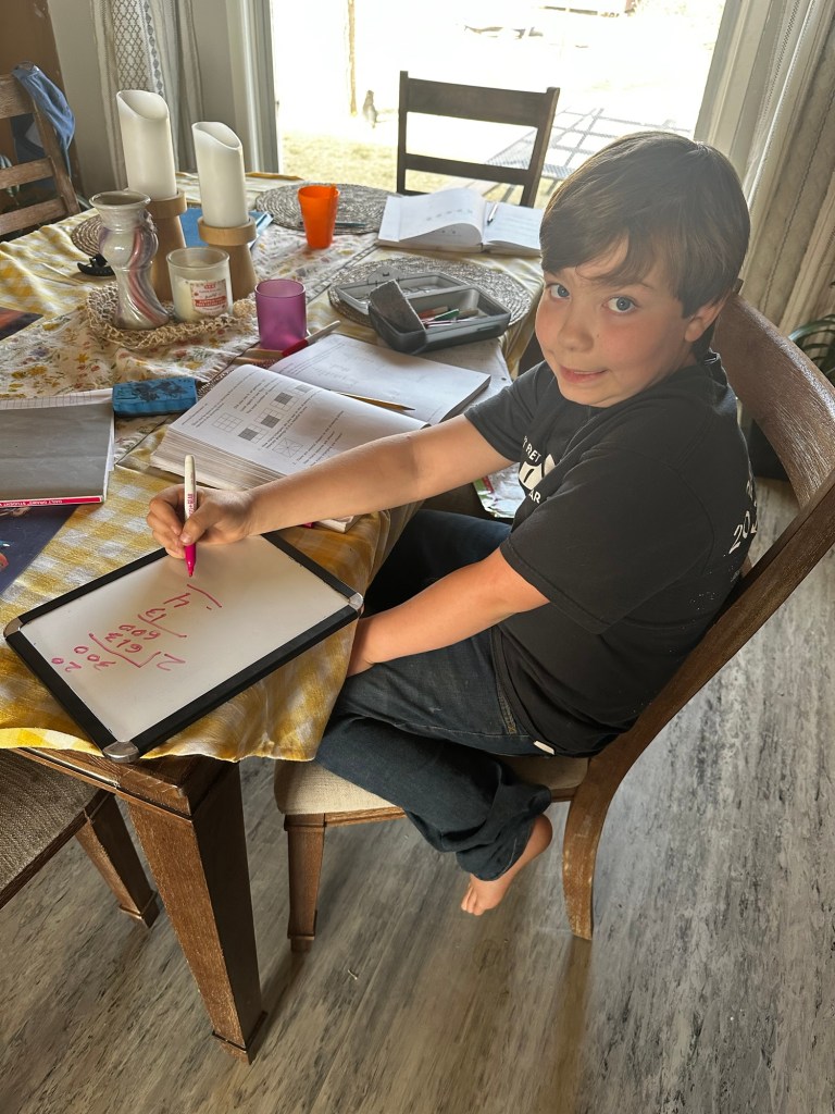 Tye, my oldest son, is working hard on math reviews. He has already asked when the banana bread will be ready.