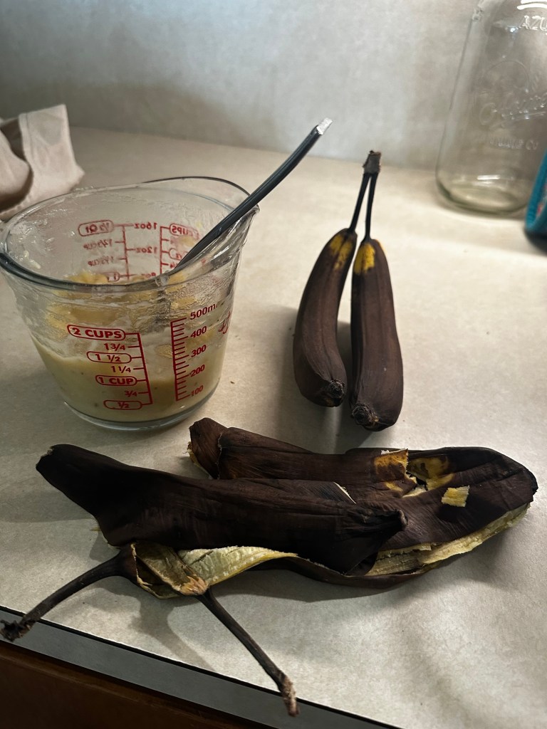 Next, mash your bananas. It takes about three. Save your peels for your compost bucket and add to your compost bin when you get a chance!