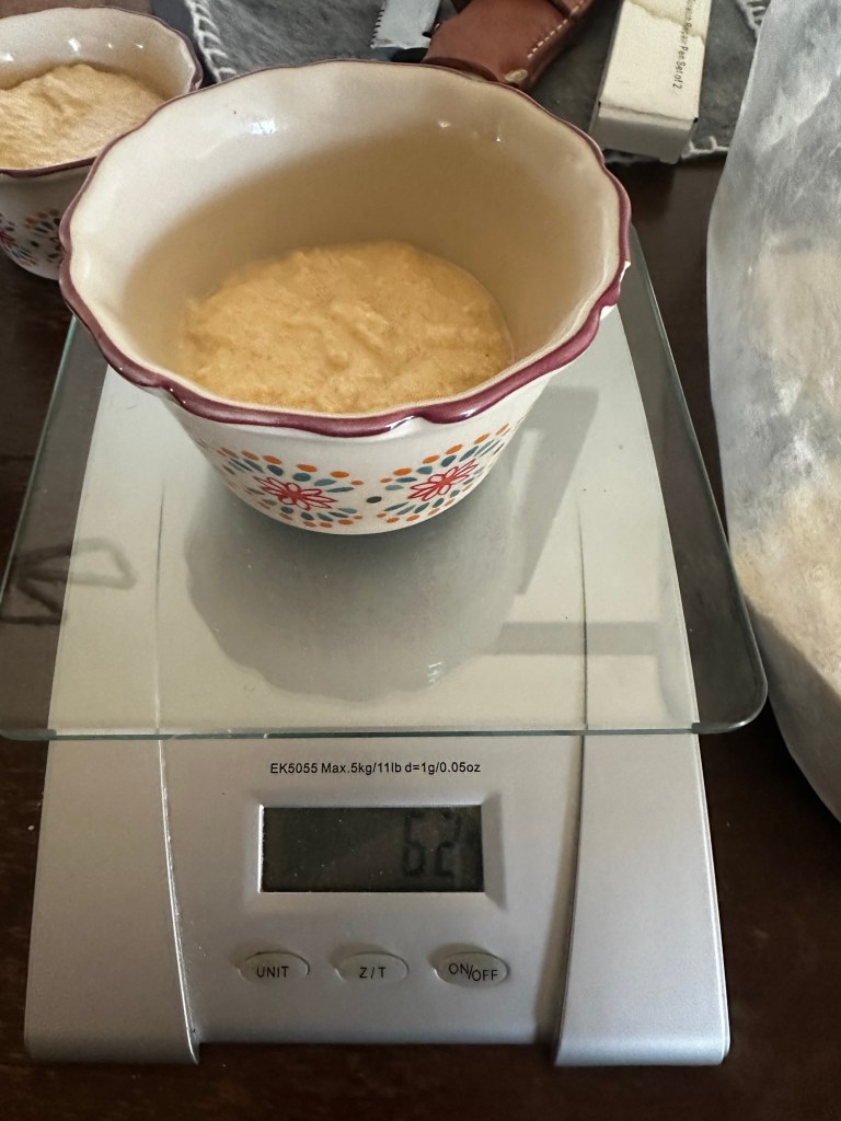 Next, measure out your sourdough discard. I use this time for feeding my sourdough as well. The recipe calls for 60 grams—or thereabouts.