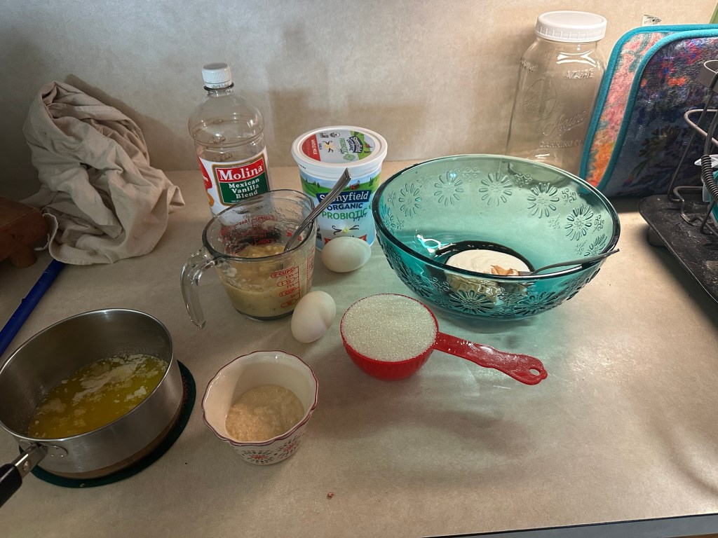 Next, gather all of your wet ingredients. I use fresh duck eggs from my Rouens. Duck eggs are incredible for baking! I use organic pure cane sugar, pure butter, and organic yogurt as well. I still want to get into making my own yogurt, but I haven’t gotten there yet.