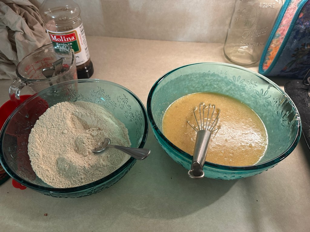 Mix all of your wet ingredients, and then mix your wet and dry ingredients together!