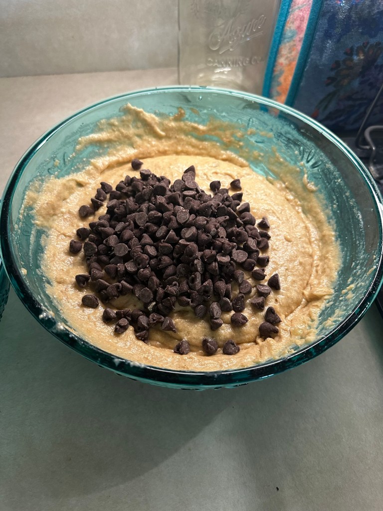 Don’t forget to add your chocolate chips! You could add nuts, but I’m not a big fan, so I choose to leave them out.