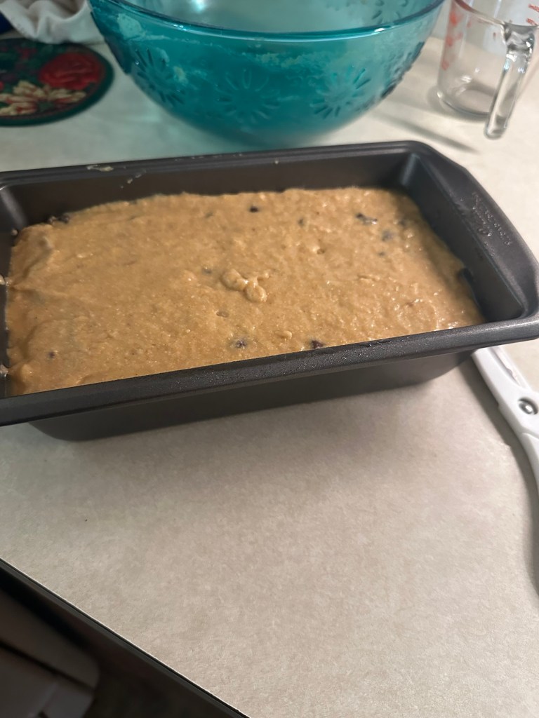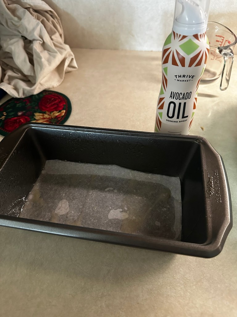 Preheat your oven to 350 degrees. Prepare your 5×9 loaf pan with oil and line with parchment paper.