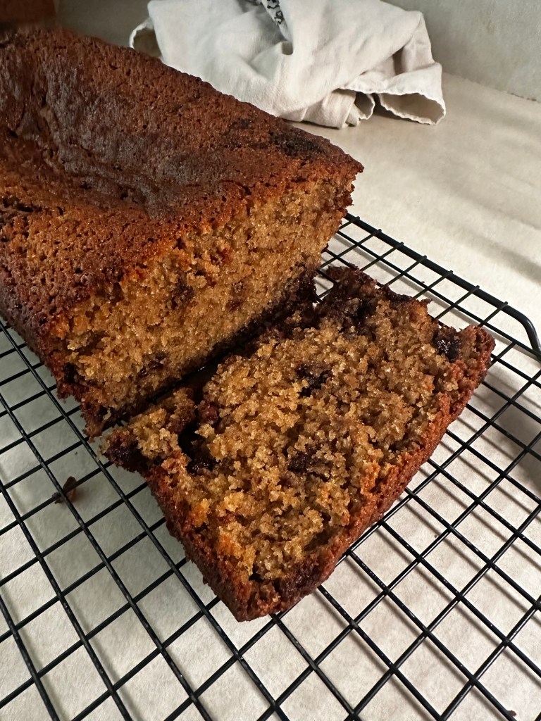 Once the bread is out of the oven, allow it to sit in the pan for about 10 minutes or so before popping it onto a cookie rack. We don’t usually let it cool completely before digging in. I love to put a pat of butter on my mine and eat with a glass of raw milk or hot tea. And wa-la! It makes the perfect mid-morning snack on a school day!