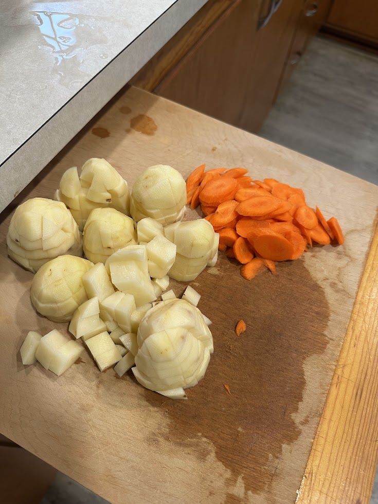 While your chicken is boiling or thawing, chop the potatoes and carrots.