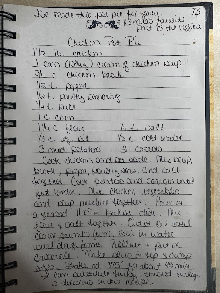 I love Momma’s chicken pot pie. I’ve been eating it ever since I can remember. When I was a teenager, I can remember Momma, Hollie, and I sitting down at the kitchen table and taking time to copy recipes down. It was a useful task that gained recipes for mine and Hollie’s hope chests–a preparation for the future. Momma made Hollie and I each a book of family recipes–recipes that we particularly enjoyed growing up. I still use this cookbook Momma gave me on a regular basis. The recipes have not only become sentimental, but a staple for all things comfort food. That being said, let’s hop to it!